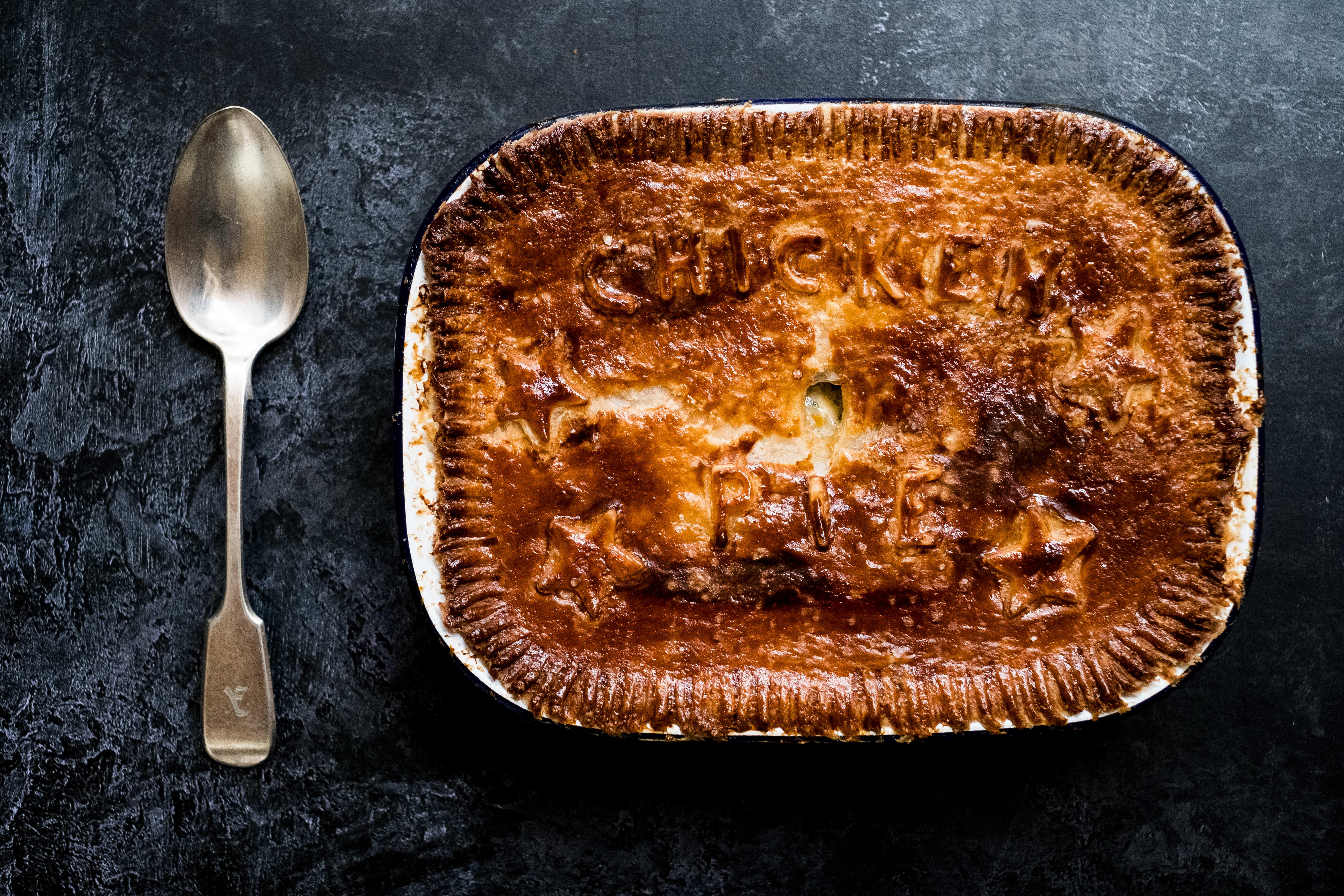 Bring the water to boil and add the butter. Let the butter melt completely. Put this into the rye flour and knead with your hands into a firm ball, adding more flour if necessary. Let rest. Then gently boil a whole chicken for 20 minutes. Remove from the water, let cool and pull off all the meat, leaving behind the skin and bones. Chop this as finely as you can. Add the spices and bread crumbs. Divide the dough into 8 pieces. With four of them form the bottom crusts with your fingers. Fill with the chicken mixture and add a piece of marrow in the middle. Roll out the other four pieces to form the top crusts and place them on, crimping the edges. Bake for 40 minutes at 375 degrees or until browned. Let cool thoroughly before eating. Serve with a spoon, to break the crust and spoon out the contents. Serves 4.